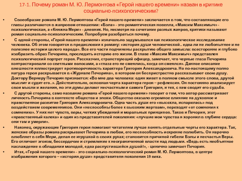 17-1. Почему роман М. Ю. Лермонтова «Герой нашего времени» назван в критике социально-психологическим?