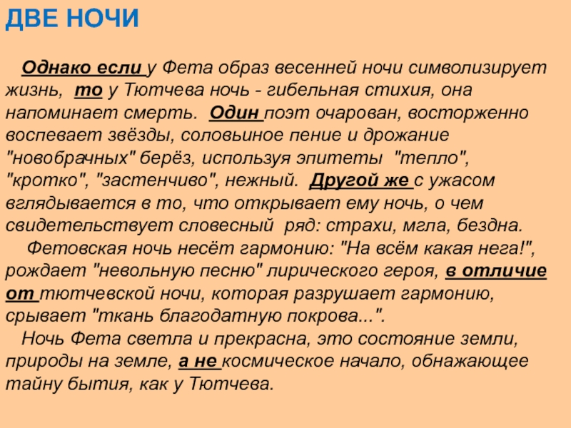 Фетовская ночь несёт гармонию: "На всём какая нега!", рождает "невольную песню" лирического героя, в отличие от тютчевской ночи, которая разрушает гармонию, срывает "ткань благодатную покрова...".