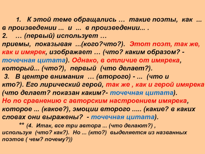 2. … (первый) использует … приемы, показывая ...(кого?что?). Этот поэт, так же, как и имярек, изображает … (что? каким образом? - точечная цитата). Однако, в отличие от имярека, который... (что?), первый (что делает?).