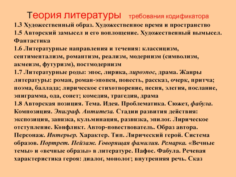 1.8 Авторская позиция. Тема. Идея. Проблематика. Сюжет, фабула. Композиция. Эпиграф. Антитеза. Стадии развития действия: экспозиция, завязка, кульминация, развязка, эпилог. Лирическое отступление. Конфликт. Автор-повествователь. Образ автора. Персонаж. Интерьер. Характер. Тип. Лирический герой. Система образов. Портрет. Пейзаж. Говорящая фамилия. Ремарка. «Вечные темы» и «вечные образы» в литературе. Пафос. Фабула. Речевая характеристика героя: диалог, монолог; внутренняя речь. Сказ