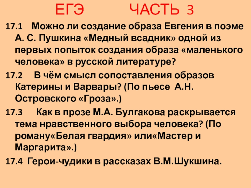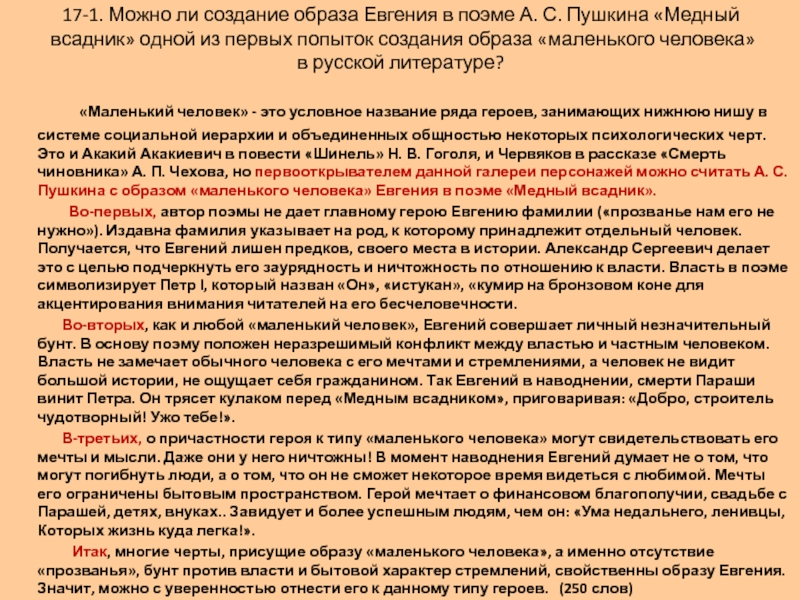 17-1. Можно ли создание образа Евгения в поэме А. С. Пушкина «Медный всадник» одной из первых попыток создания образа «маленького человека» в русской литературе?