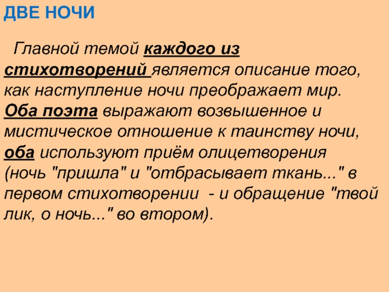 и мистическое отношение к таинству ночи, оба используют приём олицетворения (ночь "пришла" и "отбрасывает ткань..." в первом стихотворении - и обращение "твой лик, о ночь..." во втором).