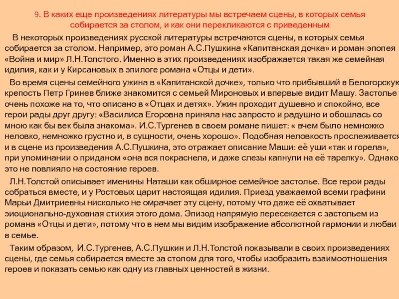 Таким образом, И.С.Тургенев, А.С.Пушкин и Л.Н.Толстой показывали в своих произведениях сцены, где семья собирается вместе за столом для того, чтобы изобразить взаимоотношения героев и показать семью как одну из главных ценностей в жизни.