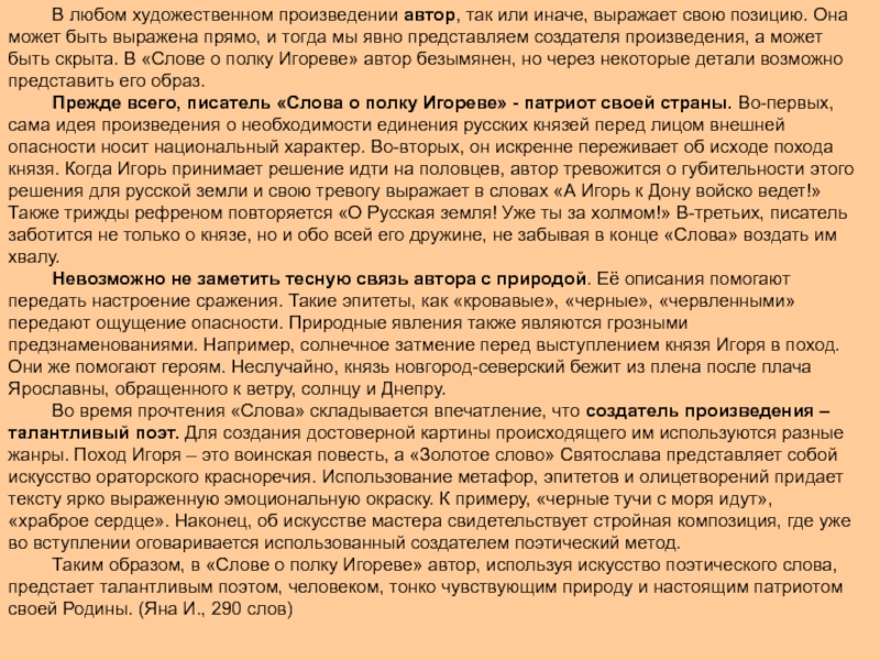 Таким образом, в «Слове о полку Игореве» автор, используя искусство поэтического слова, предстает талантливым поэтом, человеком, тонко чувствующим природу и настоящим патриотом своей Родины. (Яна И., 290 слов)