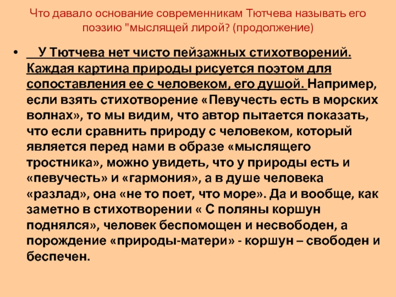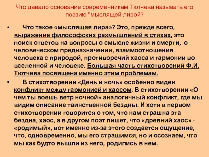 Что давало основание современникам Тютчева называть его поэзию "мыслящей лирой? (продолжение)