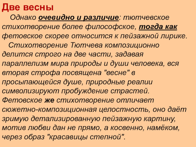 Стихотворение Тютчева композиционно делится строго на две части, задавая параллелизм мира природы и души человека, вся вторая строфа посвящена "весне" в просыпающейся душе, природные реалии символизируют пробуждение страстей. Фетовское же стихотворение отличает сюжетно-композиционная целостность, оно даёт зримую детализированную пейзажную картину, мотив любви дан не прямо, а косвенно, намёком, через образ "красавицы степной".
