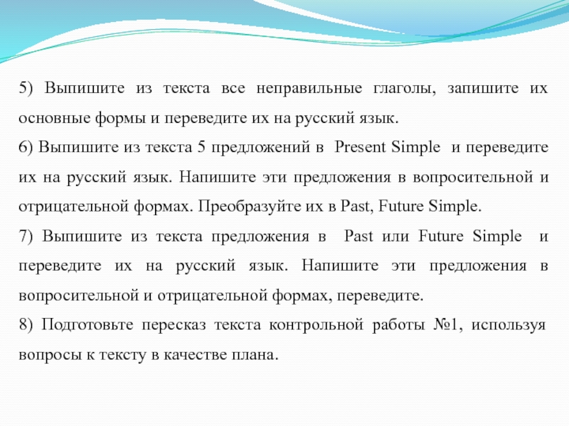 8) Подготовьте пересказ текста контрольной работы №1, используя вопросы к тексту в качестве плана.