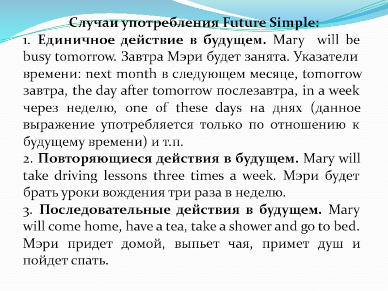 3. Последовательные действия в будущем. Mary will come home, have a tea, take a shower and go to bed. Мэри придет домой, выпьет чая, примет душ и пойдет спать.