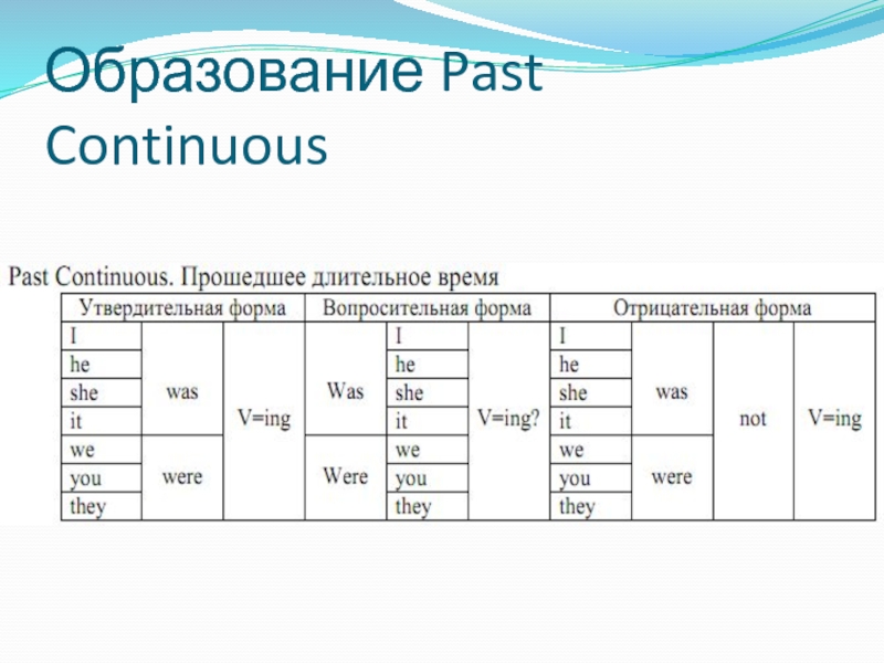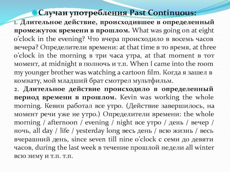 2. Длительное действие происходило в определенный период времени в прошлом. Kevin was working the whole morning. Кевин работал все утро. (Действие завершилось, на момент речи уже не утро.) Определители времени: the whole morning / afternoon / evening / night все утро / день / вечер / ночь, all day / life / yesterday long весь день / всю жизнь / весь вчерашний день, since seven till nine o'clock с семи до девяти часов, during the last week в течение прошлой недели all winter всю зиму и т.п. т.п.