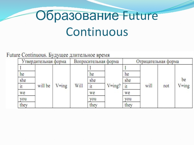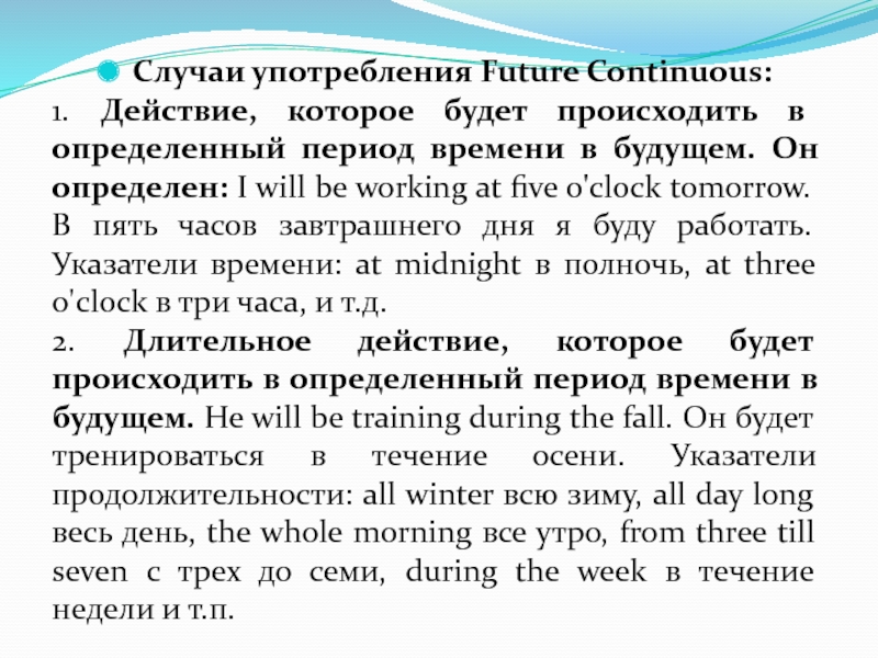 2. Длительное действие, которое будет происходить в определенный период времени в будущем. He will be training during the fall. Он будет тренироваться в течение осени. Указатели продолжительности: all winter всю зиму, all day long весь день, the whole morning все утро, from three till seven с трех до семи, during the week в течение недели и т.п.