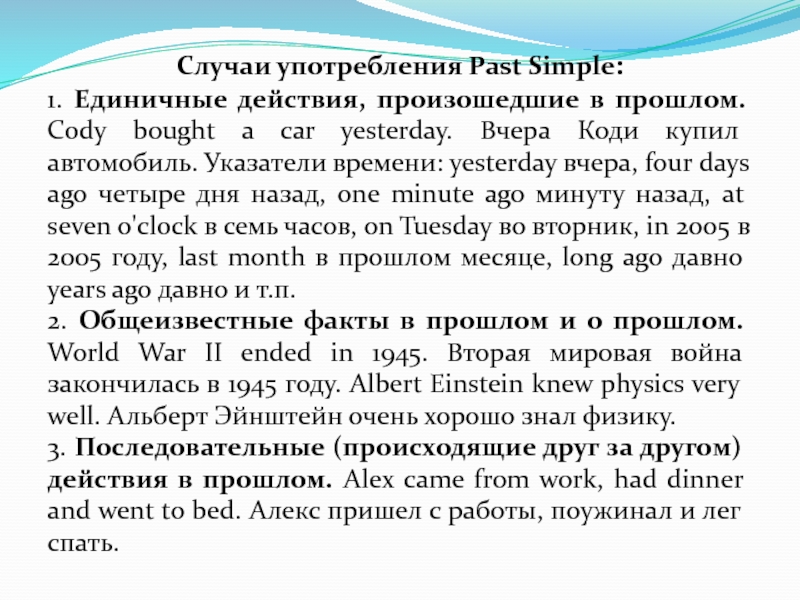 2. Общеизвестные факты в прошлом и о прошлом. World War II ended in 1945. Вторая мировая война закончилась в 1945 году. Albert Einstein knew physics very well. Альберт Эйнштейн очень хорошо знал физику.