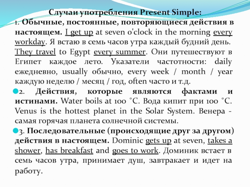 3. Последовательные (происходящие друг за другом) действия в настоящем. Dominic gets up at seven, takes a shower, has breakfast and goes to work. Доминик встает в семь часов утра, принимает душ, завтракает и идет на работу.