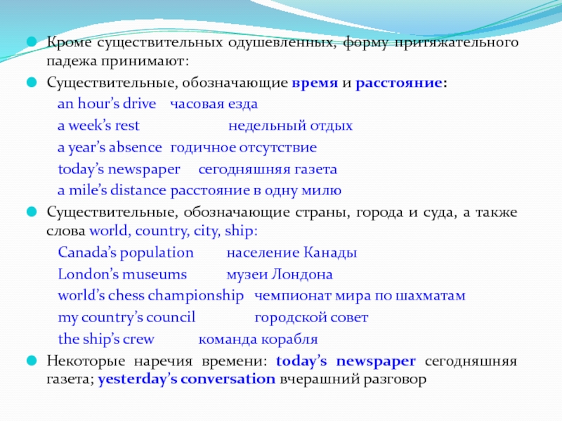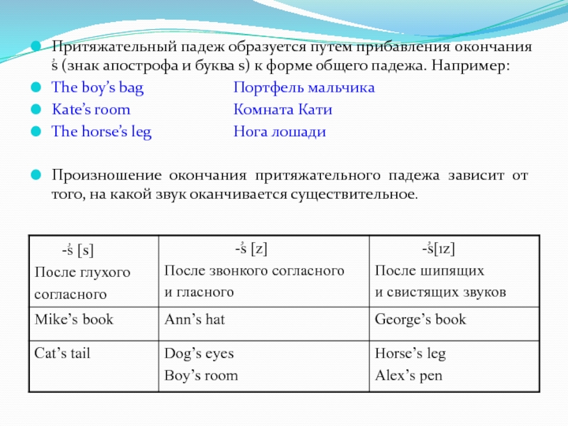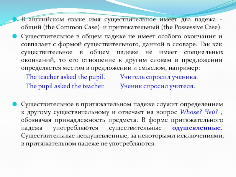 Существительное в притяжательном падеже служит определением к другому существительному и отвечает на вопрос Whose? Чей? , обозначая принадлежность предмета. В форме притяжательного падежа употребляются существительные одушевленные. Существительные неодушевленные, за некоторыми исключениями, в притяжательном падеже не употребляются.