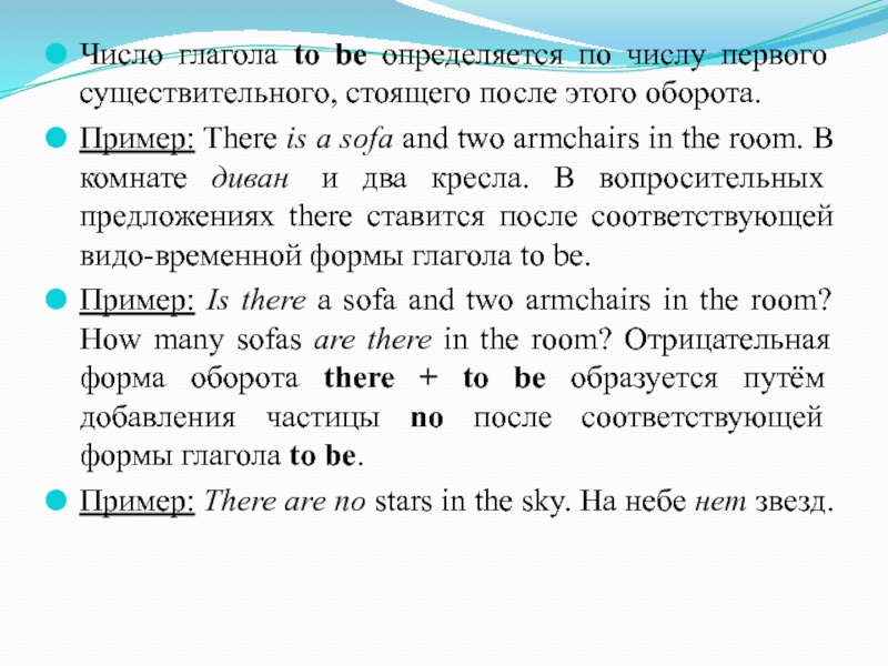 Пример: Is there a sofa and two armchairs in the room? How many sofas are there in the room? Отрицательная форма оборота there + to be образуется путём добавления частицы no после соответствующей формы глагола to be.