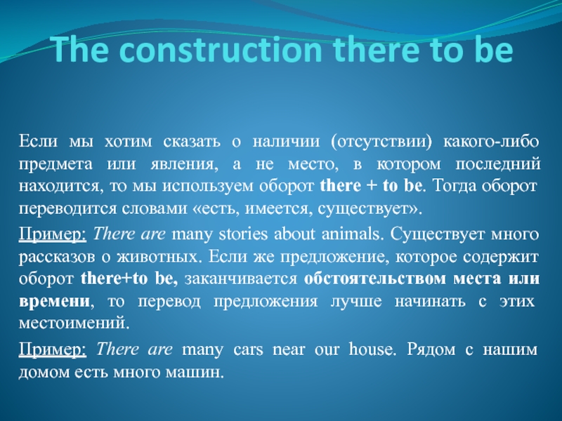 Пример: There are many stories about animals. Существует много рассказов о животных. Если же предложение, которое содержит оборот there+to be, заканчивается обстоятельством места или времени, то перевод предложения лучше начинать с этих местоимений.