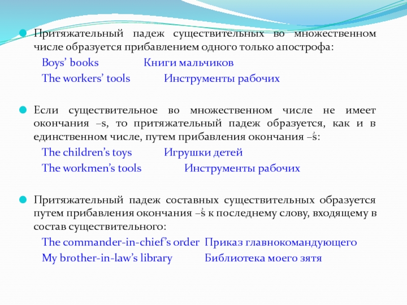 множественном числе не имеет окончания –s, то притяжательный падеж образуется, как и в единственном числе, путем прибавления окончания –ۥs: