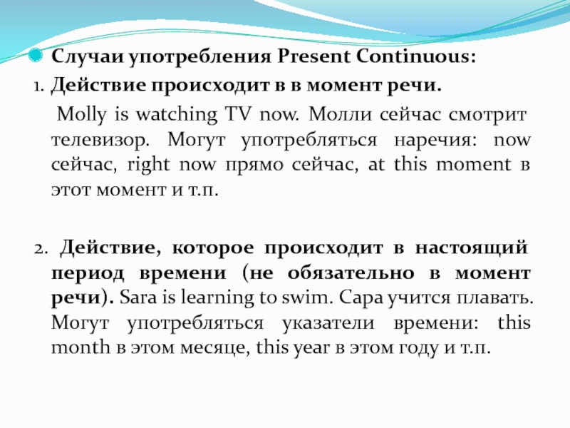 смотрит телевизор. Могут употребляться наречия: now сейчас, right now прямо сейчас, at this moment в этот момент и т.п.
