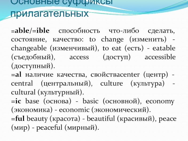 =able/=ible способность что-либо сделать, состояние, качество: to change
