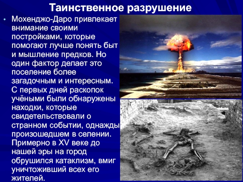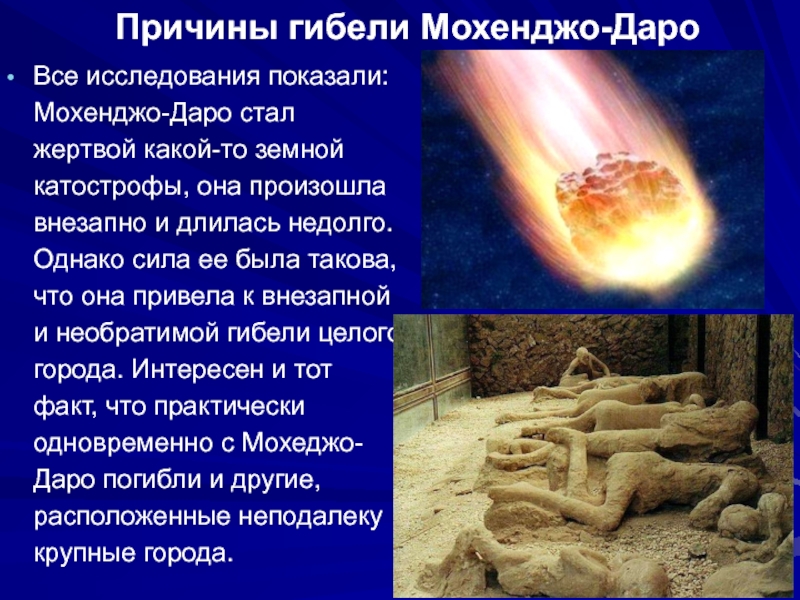 Причины гибели Мохенджо-Даро Все исследования показали: Мохенджо-Даро стал жертвой какой-то земной катострофы, она произошла внезапно и длилась