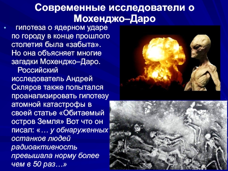 Мохенджо–Даро.    Российский исследователь Андрей Скляров также попытался проанализировать гипотезу атомной катастрофы в своей статье «Обитаемый остров Земля» Вот что он писал: «… у обнаруженных останков людей радиоактивность превышала норму более чем в 50 раз…»