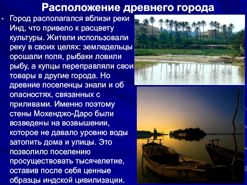 Расположение древнего городаГород располагался вблизи реки Инд, что привело к расцвету культуры. Жители использовали реку в своих