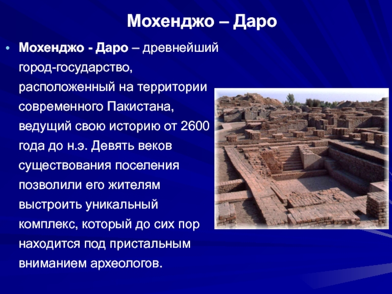 Мохенджо – ДароМохенджо - Даро – древнейший город-государство, расположенный на территории современного Пакистана, ведущий свою историю от