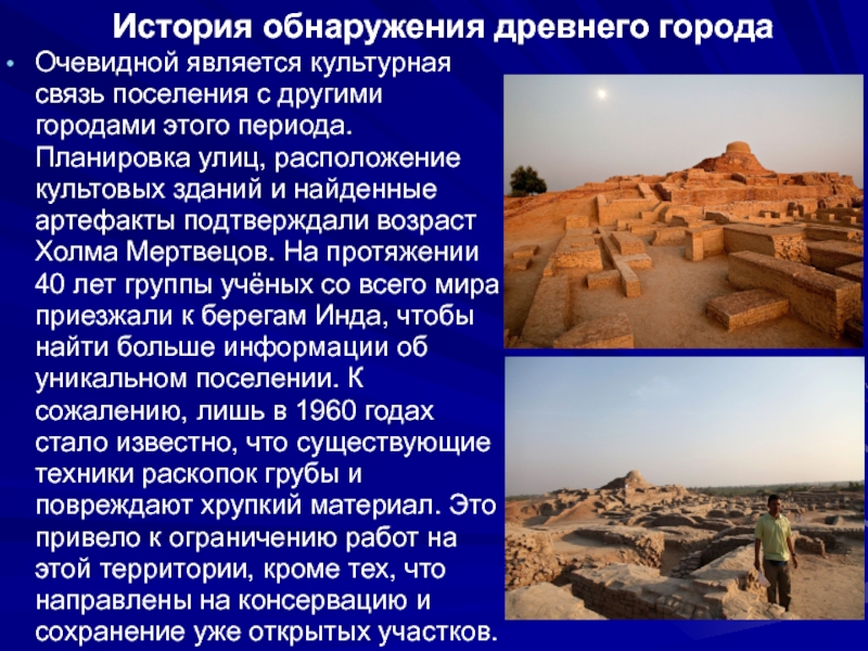 артефакты подтверждали возраст Холма Мертвецов. На протяжении 40 лет группы учёных со всего мира приезжали к берегам Инда, чтобы найти больше информации об уникальном поселении. К сожалению, лишь в 1960 годах стало известно, что существующие техники раскопок грубы и повреждают хрупкий материал. Это привело к ограничению работ на этой территории, кроме тех, что направлены на консервацию и сохранение уже открытых участков.