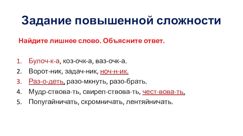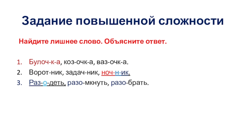 Булоч-к-а, коз-очк-а, ваз-очк-а.
