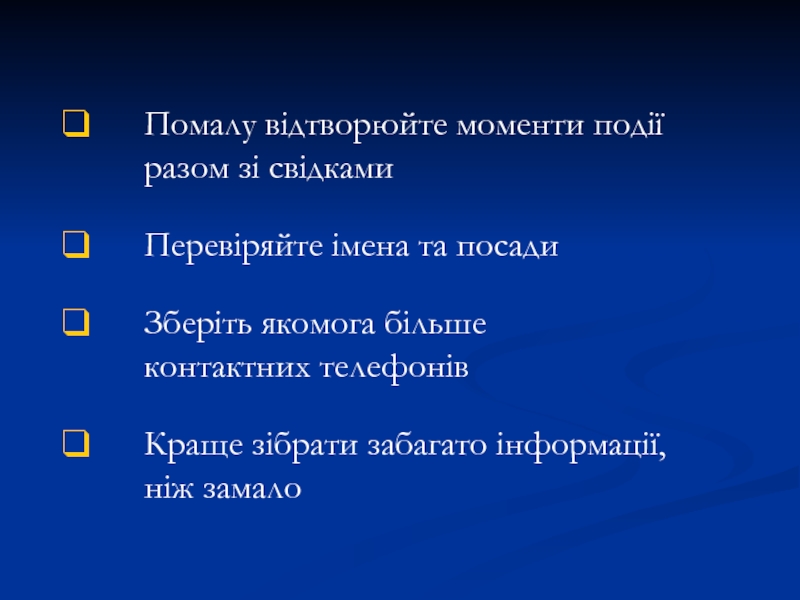 Помалу відтворюйте моменти події разом зі свідкамиПеревіряйте імена та посадиЗберіть якомога більше  контактних телефонівКраще зібрати забагато