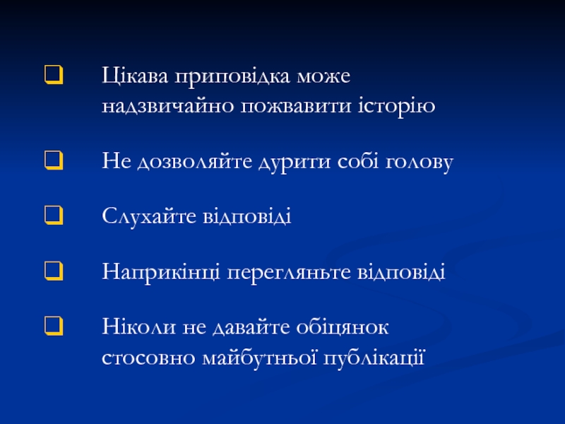 Починаючи інтерв’ю, слід знати, чого ти від нього очікуєш Знайти якомога більше інформації до інтерв’юПрості питання – найкращіУ розповідях про події, відтворюйте хронологію того, що сталося