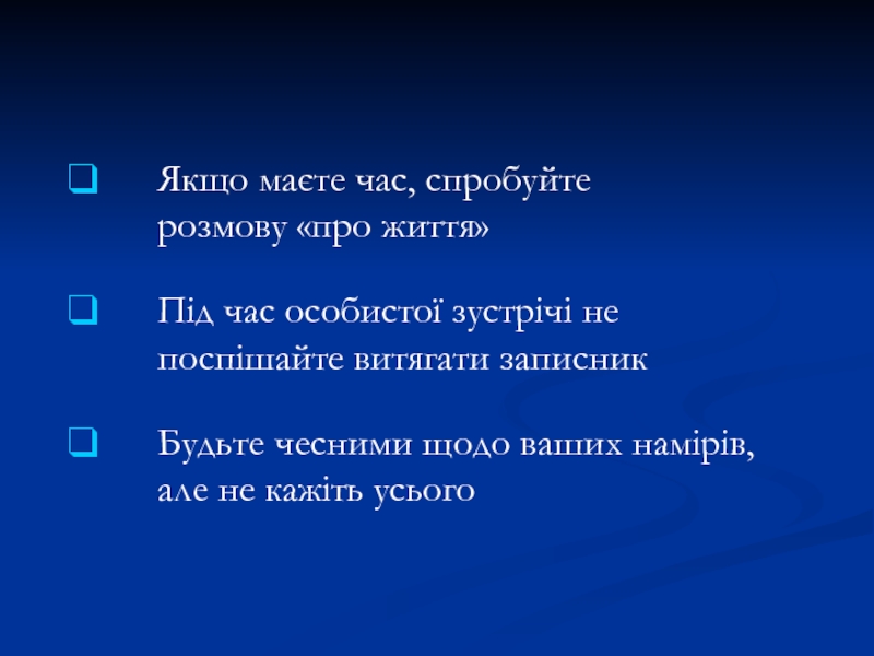 Якщо маєте час, спробуйте  розмову «про життя»Під час особистої зустрічі не поспішайте витягати записникБудьте чесними щодо