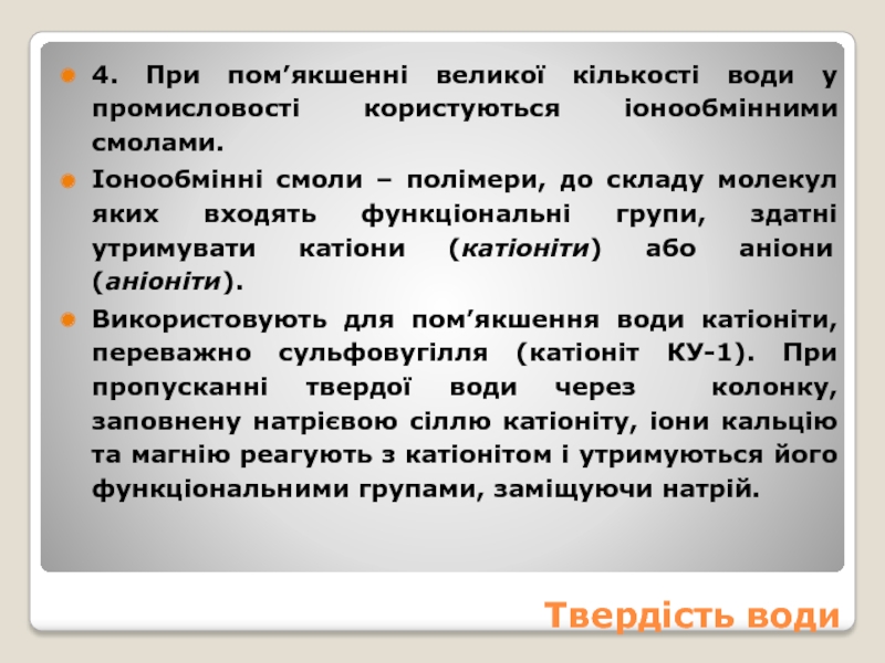 Використовують для пом’якшення води катіоніти, переважно сульфовугілля (катіоніт КУ-1). При пропусканні твердої води через колонку, заповнену натрієвою сіллю катіоніту, іони кальцію та магнію реагують з катіонітом і утримуються його функціональними групами, заміщуючи натрій.