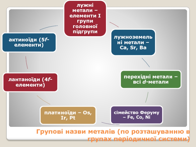 Слайд 3Групові назви металів (по розташуванню в групах періодичної системи)