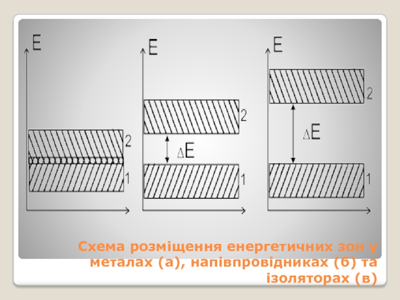 Слайд 4Схема розміщення енергетичних зон у металах (а), напівпровідниках (б) та