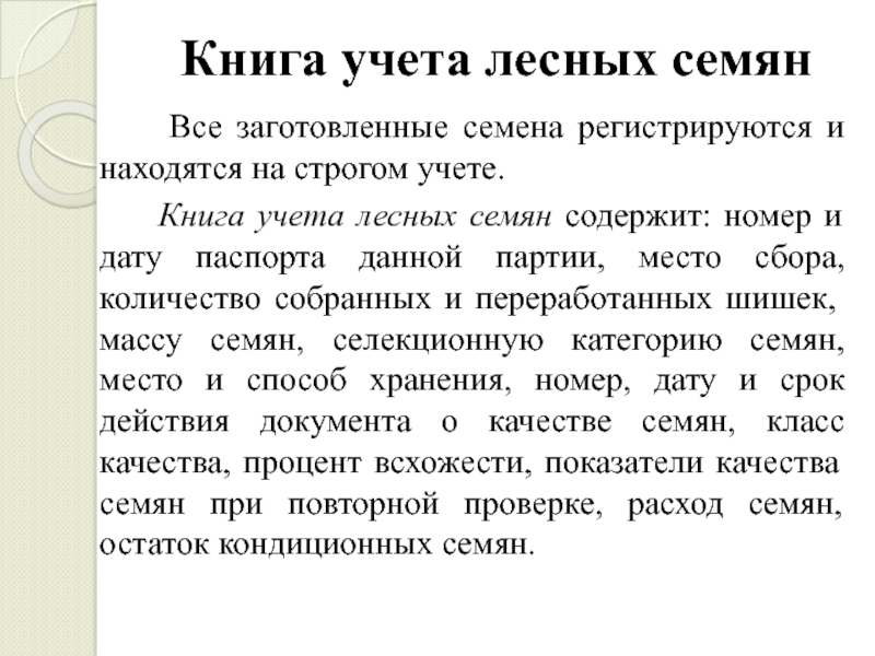 лесных семян содержит: номер и дату паспорта данной партии, место сбора, количество собранных и переработанных шишек, массу семян, селекционную категорию семян, место и способ хранения, номер, дату и срок действия документа о качестве семян, класс качества, процент всхожести, показатели качества семян при повторной проверке, расход семян, остаток кондиционных семян.