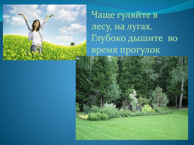 Слайд 8Чаще гуляйте в лесу, на лугах. Глубоко дышите во время