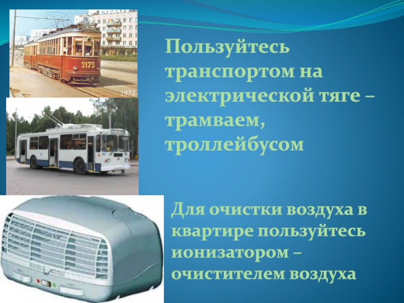Пользуйтесь транспортом на электрической тяге – трамваем, троллейбусом Для очистки воздуха в квартире пользуйтесь ионизатором – очистителем