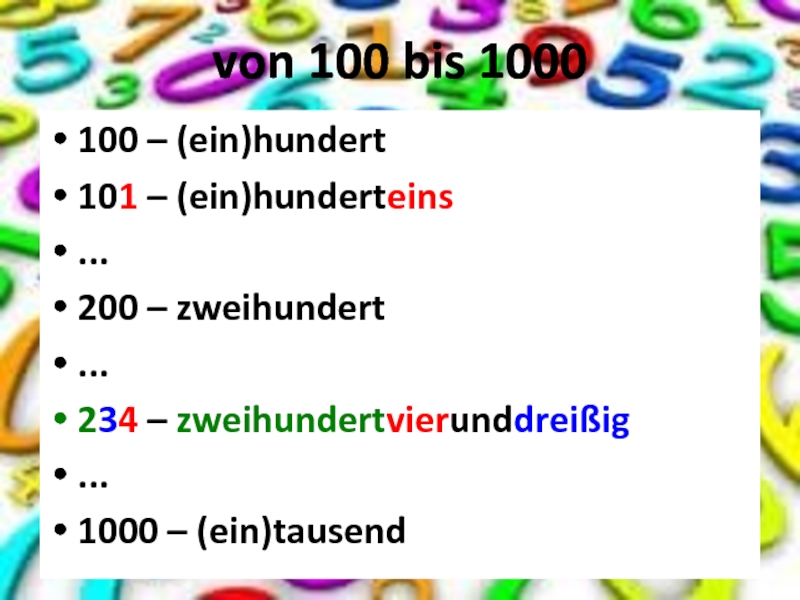 von 100 bis 1000100 – (ein)hundert101 – (ein)hunderteins...200 – zweihundert...234 – zweihundertvierunddreißig...1000 – (ein)tausend
