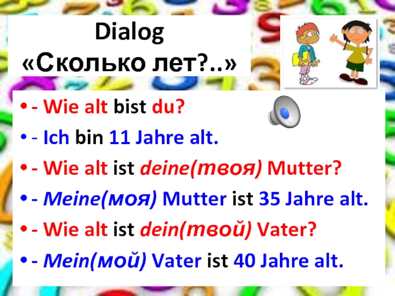 Dialog «Сколько лет?..»- Wie alt bist du?- Ich bin 11 Jahre alt.- Wie alt ist deine(твоя) Mutter?-