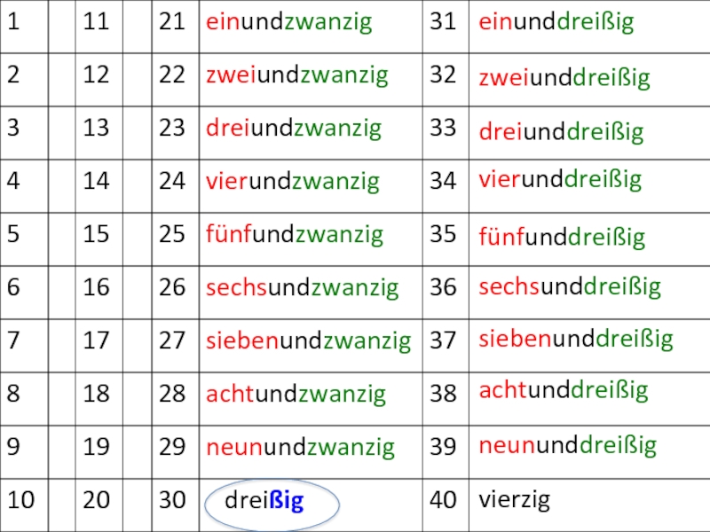 einunddreißigzweiunddreißigdreiunddreißigvierunddreißigfünfunddreißigsechsunddreißigsiebenunddreißigachtunddreißigneununddreißigvierzig