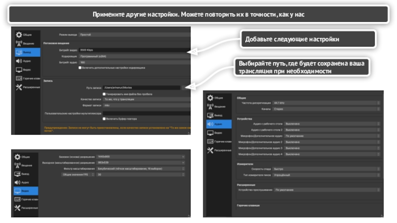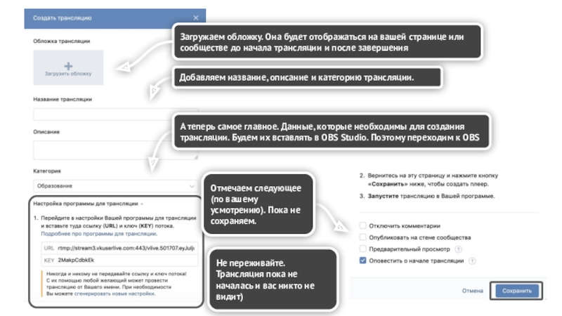 А теперь самое главное. Данные, которые необходимы для создания трансляции. Будем их вставлять в OBS Studio. Поэтому переходим к OBS