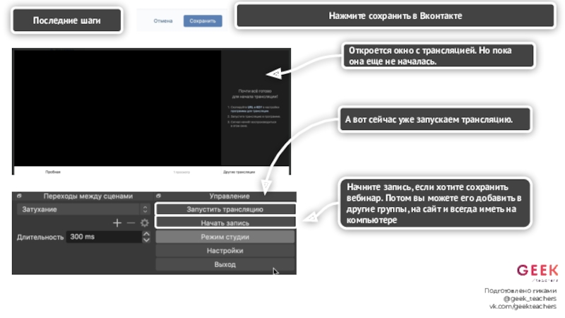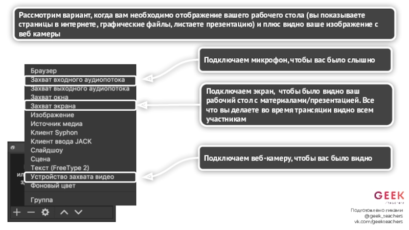 Подключаем экран, чтобы было видно ваш рабочий стол с материалами/презентацией. Все что вы делаете во время трансяции видно всем участникам