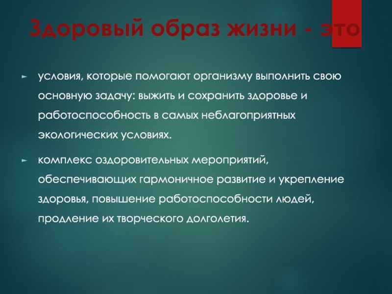 комплекс оздоровительных мероприятий, обеспечивающих гармоничное развитие и укрепление здоровья, повышение работоспособности людей, продление их творческого долголетия.