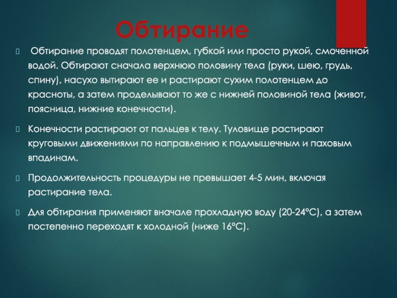 Обтирание проводят полотенцем, губкой или просто рукой, смоченной водой. Обтирают