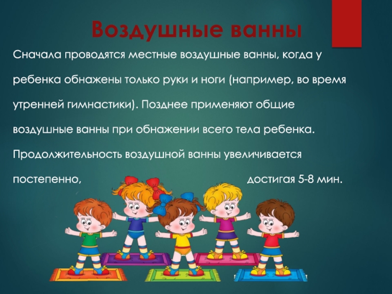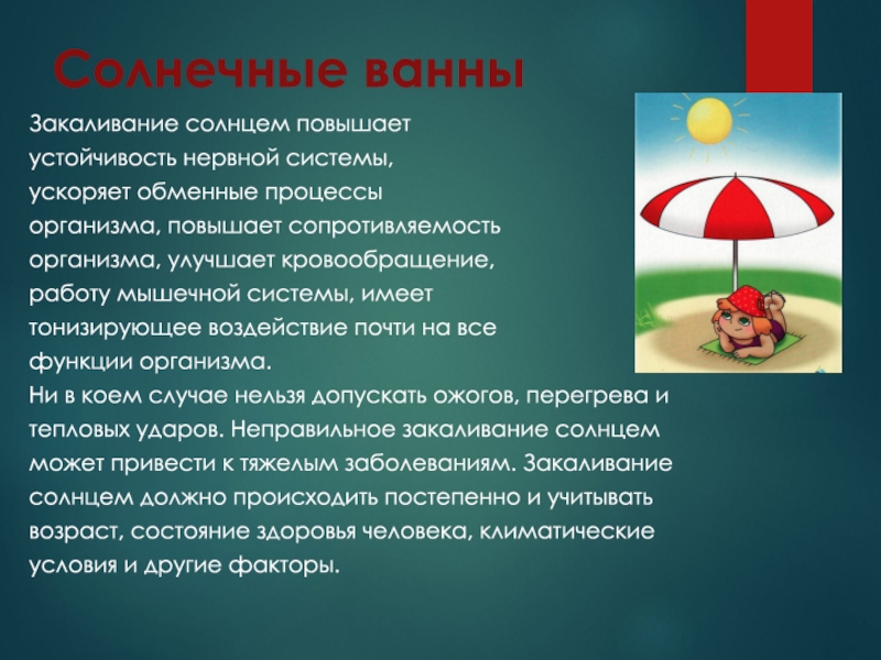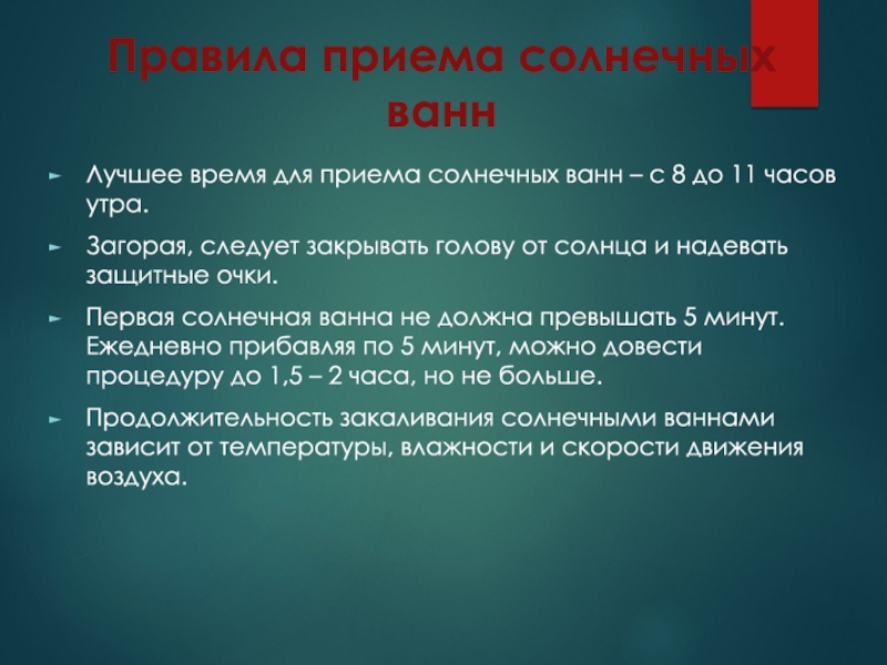 Продолжительность закаливания солнечными ваннами зависит от температуры, влажности и скорости движения воздуха.