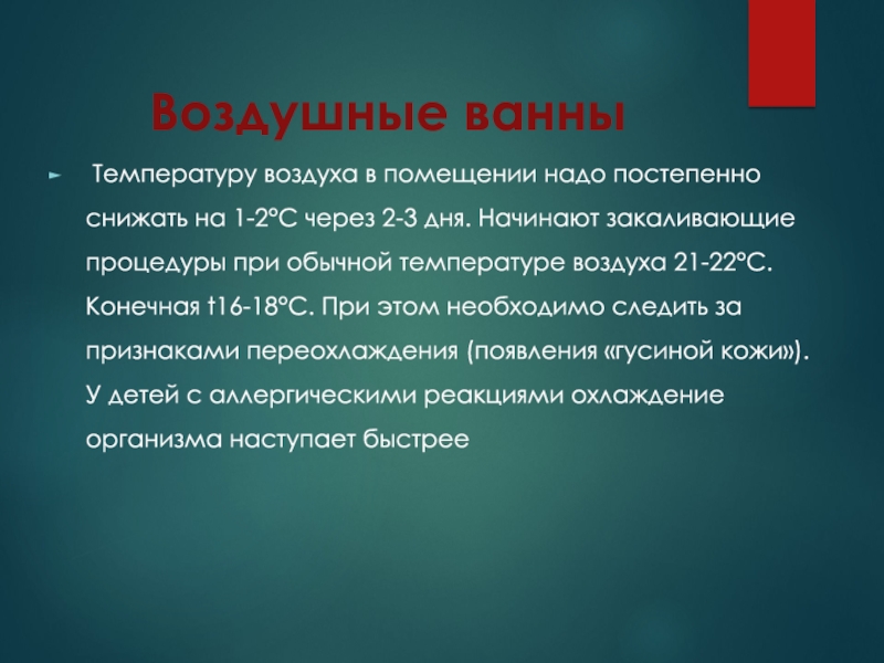 21-22°С. Конечная t16-18°С. При этом необходимо следить за признаками переохлаждения (появления «гусиной кожи»). У детей с аллергическими реакциями охлаждение организма наступает быстрее