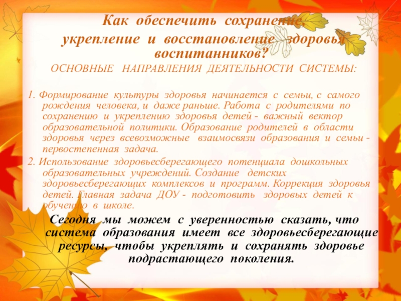Сегодня мы можем с уверенностью сказать, что сиcтема образования имеет все здоровьесберегающие ресурсы, чтобы укреплять и сохранять здоровье подрастающего поколения.