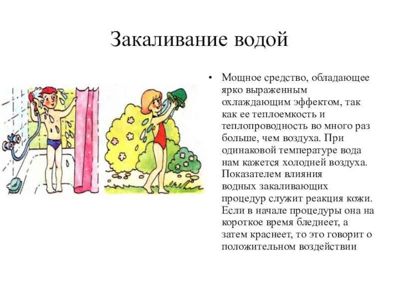 Закаливание водой Мощное средство, обладающее ярко выраженным охлаждающим эффектом, так как ее теплоемкость и теплопроводность во много