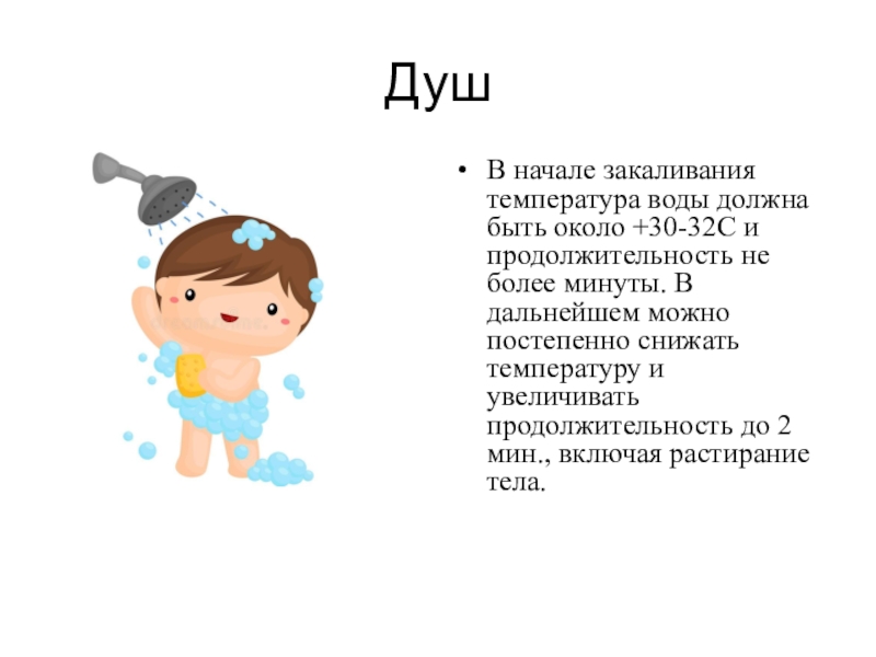 Душ  В начале закаливания температура воды должна быть около +30-32С и продолжительность не более минуты. В дальнейшем можно