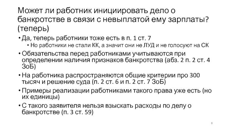 Слайд 8Может ли работник инициировать дело о банкротстве в связи с